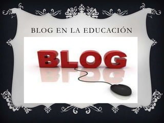 El documento habla sobre el uso de blogs en la educación. Explica que los blogs se pueden usar para el desarrollo profesional de docentes, como plataformas de comunicación entre escuelas y comunidades, y para que profesores compartan contenidos y actividades con estudiantes. También menciona que los blogs ayudan a fomentar la lectura y escritura entre estudiantes, y que las universidades los usan como complemento a la enseñanza presencial.