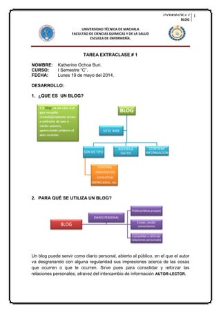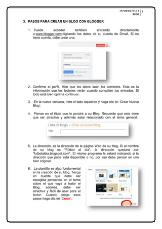 Este documento describe cómo crear y usar un blog. Explica que un blog es un sitio web que publica artículos de forma cronológica y que puede usarse como diario personal o para fines periodísticos, educativos o empresariales. Luego proporciona los pasos para crear un blog gratis usando Blogger, incluyendo elegir un título, plantilla y dirección, y agregar entradas y enlaces. Finalmente, brinda descripciones breves de cuatro sitios populares para crear blogs gratuitos: OboLog, HazBlog, Dada.