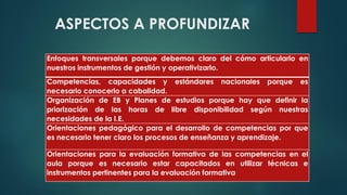 Este documento presenta los primeros pasos para implementar el Currículo Nacional en la Institución Educativa Parroquial Padre Abad de Tingo María. Se identifican cinco aspectos a profundizar y tres aspectos priorizados a implementar, los cuales son competencias, estándares nacionales y orientaciones pedagógicas. El documento propone cinco acciones clave para llevar a cabo la implementación, que incluyen capacitaciones, trabajos colegiados, autocapacitación virtual, pasantías y monitoreo entre pares.