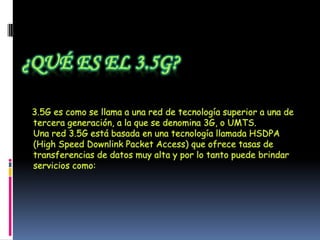 La red 3.5G ofrece tasas de transferencia de datos más altas que la red 3G, permitiendo servicios como video llamadas, streaming de video, descarga de música y videos, y acceso a banda ancha móvil. Se basa en la tecnología HSDPA que mejora las velocidades de descarga, aunque no las de subida. Los teléfonos 3.5G son compatibles con redes GSM, 3G y 3.5G, y las velocidades de descarga de 3.5G pueden alcanzar los 14 Mbps.