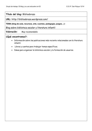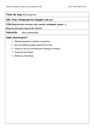 El documento resume 4 blogs educativos recomendados para educación infantil. El primer blog, Biblioabrazo, ofrece información sobre literatura infantil y cómo organizar una biblioteca escolar. El segundo blog, Mis Gorgoritos, contiene cuentos, proyectos, juegos y canciones educativas. El tercer blog, Etapa Infantil, incluye recursos para el aula y para que los profesores utilicen las TIC. El cuarto blog, La Clase de Luna, comparte actividades TIC y proyectos temáticos para realizar