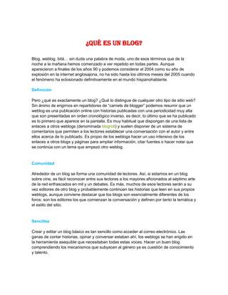 El documento explica qué es un blog. Un blog es una página web con contenido publicado en orden cronológico inverso, donde los lectores pueden comentar y establecer conversaciones. Los blogs permiten a comunidades de lectores con intereses similares debatir sobre temas. Crear un blog básico es sencillo, pero requiere conocimiento y talento para administrarlo bien.
