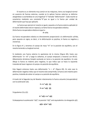 El sistema masa-resorte consiste en una masa unida a un resorte fijo que oscila en torno a una posición de equilibrio cuando se le aplica una fuerza externa. La fuerza recuperadora elástica del resorte es proporcional a su deformación y se puede describir mediante la ley de Hooke. El período y la frecuencia de oscilación dependen de la masa y la constante del resorte, donde mayor masa resulta en menor frecuencia y mayor constante de resorte en mayor frecuencia.