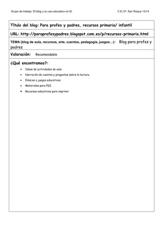 Este documento resume cinco blogs educativos recomendados para profesores y padres. Los blogs contienen ideas de actividades para el aula, cuentos, enlaces a juegos educativos, materiales didácticos y recursos para imprimir en diferentes áreas como idiomas, matemáticas y artes.