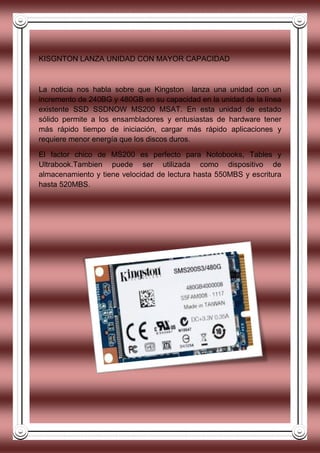 Kingston lanza unidades SSD con mayor capacidad de 240GB y 480GB, lo que permite iniciar y cargar aplicaciones más rápido y requiere menos energía que los discos duros. AMD presenta su tarjeta gráfica R9 295X2, la más rápida del mundo capaz de ejecutar juegos a resolución 4K. Genius presenta nuevos kits inalámbricos de teclado y mouse con teclas funcionales y sensor óptico de alta precisión, con una autonomía de batería de hasta 18 meses.