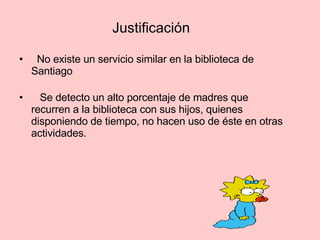 Este documento propone crear un blog y taller en la biblioteca de Santiago para enseñar a madres a usar herramientas tecnológicas que ayuden en el aprendizaje y desarrollo de sus hijos. El objetivo es enseñar a las madres a usar estas herramientas de manera didáctica para que puedan cumplir un rol más activo en la educación de sus hijos. El proyecto beneficiaría directamente a las madres socias de la biblioteca y indirectamente a sus hijos.