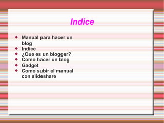 Este documento explica cómo crear y personalizar un blog en Blogger. Primero, se requiere una cuenta de Gmail. Luego, se crea el blog escogiendo un título y una dirección URL con ".blogspot.com". Una vez creado, se puede configurar el diseño, agregar gadgets como relojes y calendarios, y cambiar colores y fuentes. También explica cómo subir documentos a SlideShare para compartirlos en el blog.