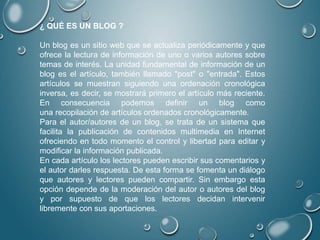 Este documento define y describe los blogs. Explica que un blog es un sitio web que se actualiza periódicamente con artículos de uno o más autores sobre temas de interés, ordenados cronológicamente de forma inversa. Describe la estructura de un blog, incluyendo el frente y la parte posterior, y diferentes tipos como fotoblogs, videoblogs y microblogs. Concluye que los blogs ofrecen una experiencia más dinámica que las páginas web estáticas al permitir comentarios y ordenar las entradas por fecha.