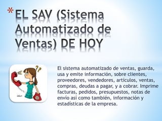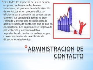 El documento describe varios sistemas automatizados para gestionar información empresarial como clientes, proveedores, ventas, compras, deudas y finanzas. También cubre temas relacionados como la administración de contactos, CRM móvil, ventas móviles, toma de decisiones, satisfacción de clientes, comunicación, relaciones públicas, y normas internas y externas.