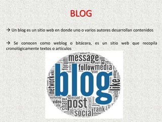 Un blog es un sitio web donde uno o más autores publican contenidos de forma cronológica. Los blogs permiten la colaboración de otros usuarios mediante comentarios y enlaces a otros sitios. Son gratuitos y existen muchas plataformas para crear blogs como Wordpress y Blogger. Los bloggers administran su blog a través de un sistema de gestión de contenidos que les permite crear, editar y moderar entradas y comentarios. Los blogs son útiles para los contadores públicos porque facilitan la comunicación rápida sobre temas de contaduría y permiten