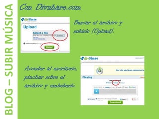 Divshare permite subir música, imágenes, videos y documentos a un blog. Se requiere crear una cuenta en Divshare y luego buscar y subir el archivo. Finalmente, se copia el código HTML del reproductor en Divshare y se pega en una nueva entrada del blog con la pestaña HTML activada.