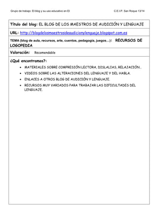 Este documento resume seis blogs educativos recomendados. Los blogs contienen recursos como fichas, videos, presentaciones y enlaces sobre temas de primer ciclo de primaria, logopedia, y atención a la diversidad. Los blogs ofrecen materiales para las asignaturas de lengua, conocimiento del medio y matemáticas.