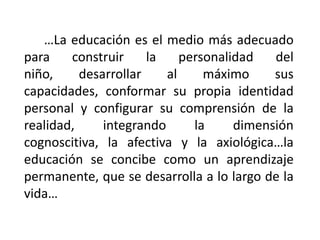 El documento describe el marco legislativo de la educación infantil en España. Establece que la Ley Orgánica de Educación de 2006 y decretos posteriores definen las enseñanzas mínimas obligatorias, así como la autonomía de las comunidades autónomas y centros educativos para completar el currículo. El currículo de educación infantil en Castilla-La Mancha se centra en el desarrollo integral del niño a través del juego, la experimentación y las áreas de aprendizaje, evaluación formativa y atención a la divers