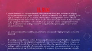 Un blog es un sitio web en el que uno o más autores publican artículos de forma cronológica. Los lectores pueden comentar y participar en conversaciones. Los blogs modernos evolucionaron de los diarios personales en línea y permiten establecer comunidades en torno a temas. Existen herramientas gratuitas que facilitan la creación y mantenimiento de blogs.