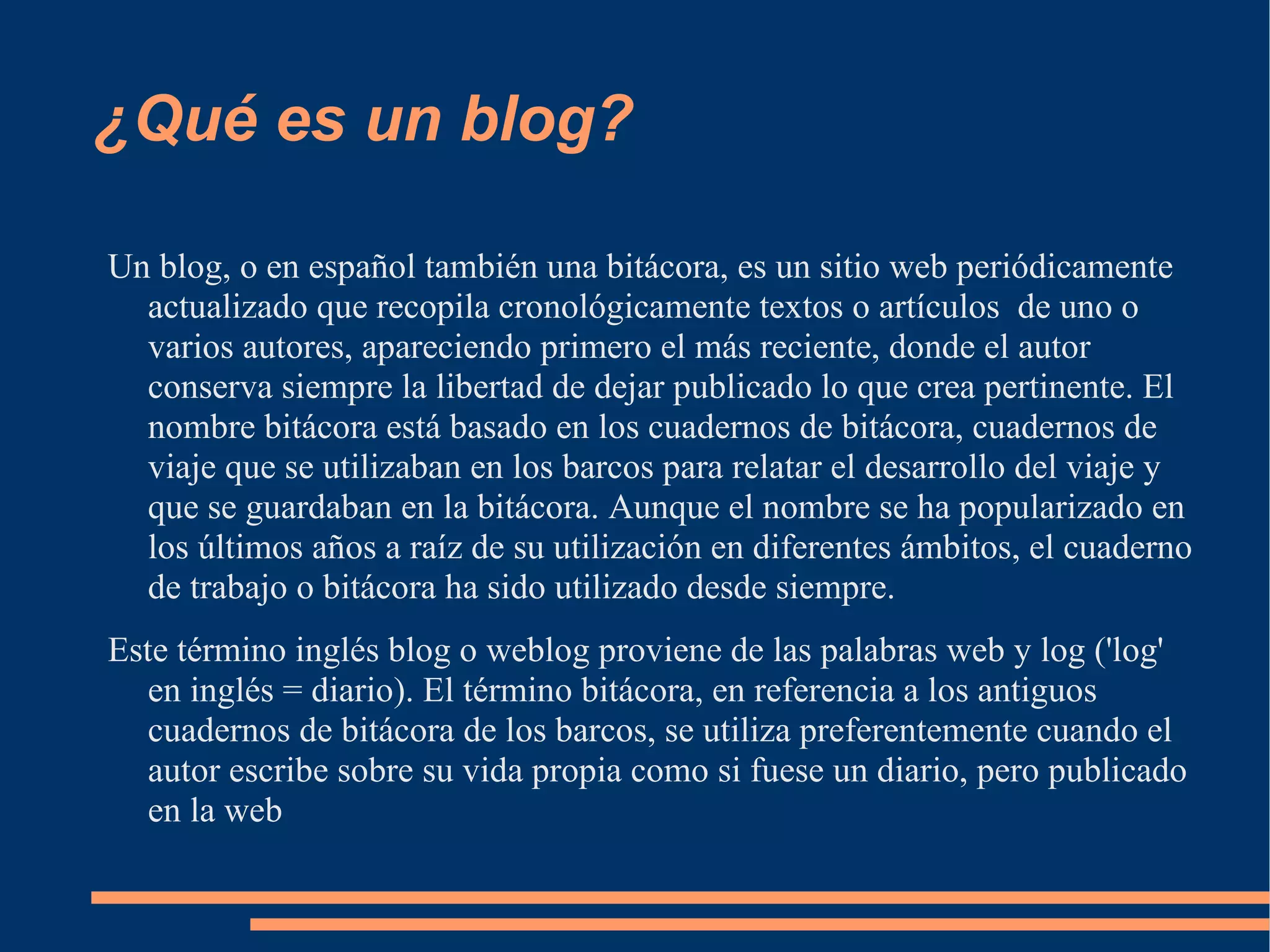 Un blog es un sitio web actualizado periódicamente que recopila cronológicamente artículos de uno o más autores. Los primeros blogs eran diarios personales en línea, pero evolucionaron para incluir una variedad de temas. Hoy en día, herramientas como Blogger y WordPress permiten a usuarios sin conocimientos técnicos crear y administrar fácilmente sus propios blogs.