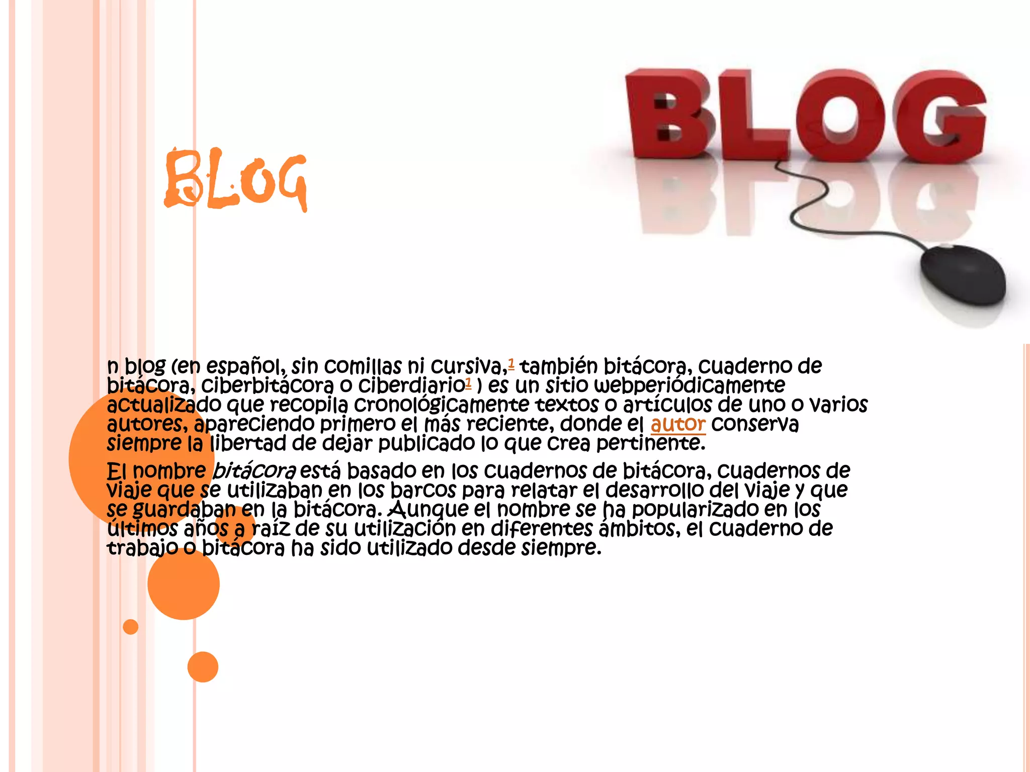 Un blog es un sitio web actualizado periódicamente que recopila cronológicamente artículos de uno o más autores, donde el autor conserva la libertad de publicar lo que considere pertinente. Scribd permite compartir documentos en varios formatos y embeberlos en páginas web. Un wiki es un sitio web cuyas páginas pueden ser editadas por múltiples voluntarios a través del navegador web.