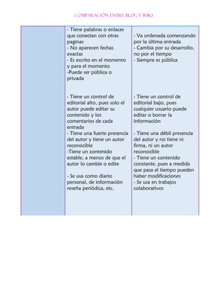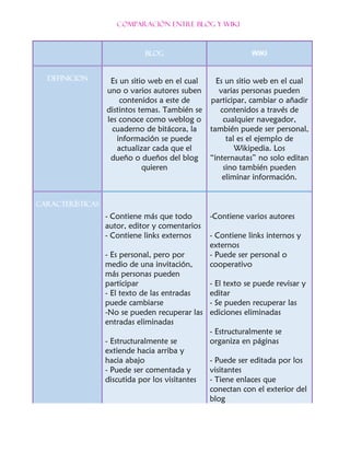 El blog es un sitio web en el que un autor o varios autores publican contenido sobre diferentes temas de forma periódica, mientras que el wiki es un sitio que permite que varias personas editen, cambien o agreguen contenido de forma colaborativa a través de un navegador. Mientras que un blog tiene un control editorial más estricto y se centra en el autor, un wiki tiene un control editorial más abierto y permite que cualquier usuario edite o elimine información.