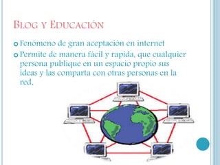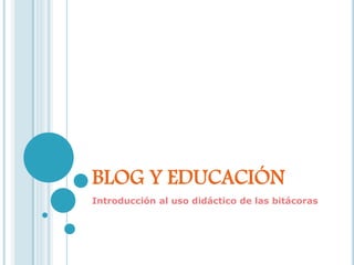 Este documento describe el uso didáctico de los blogs en la educación. Explica que los blogs permiten a los usuarios publicar y compartir fácilmente ideas en la web. También destaca que los blogs son flexibles y se pueden usar en cualquier materia o nivel educativo. Finalmente, propone varios usos posibles de los blogs en el aula, como blogs de aula, blogs personales de estudiantes, y proyectos de grupo.