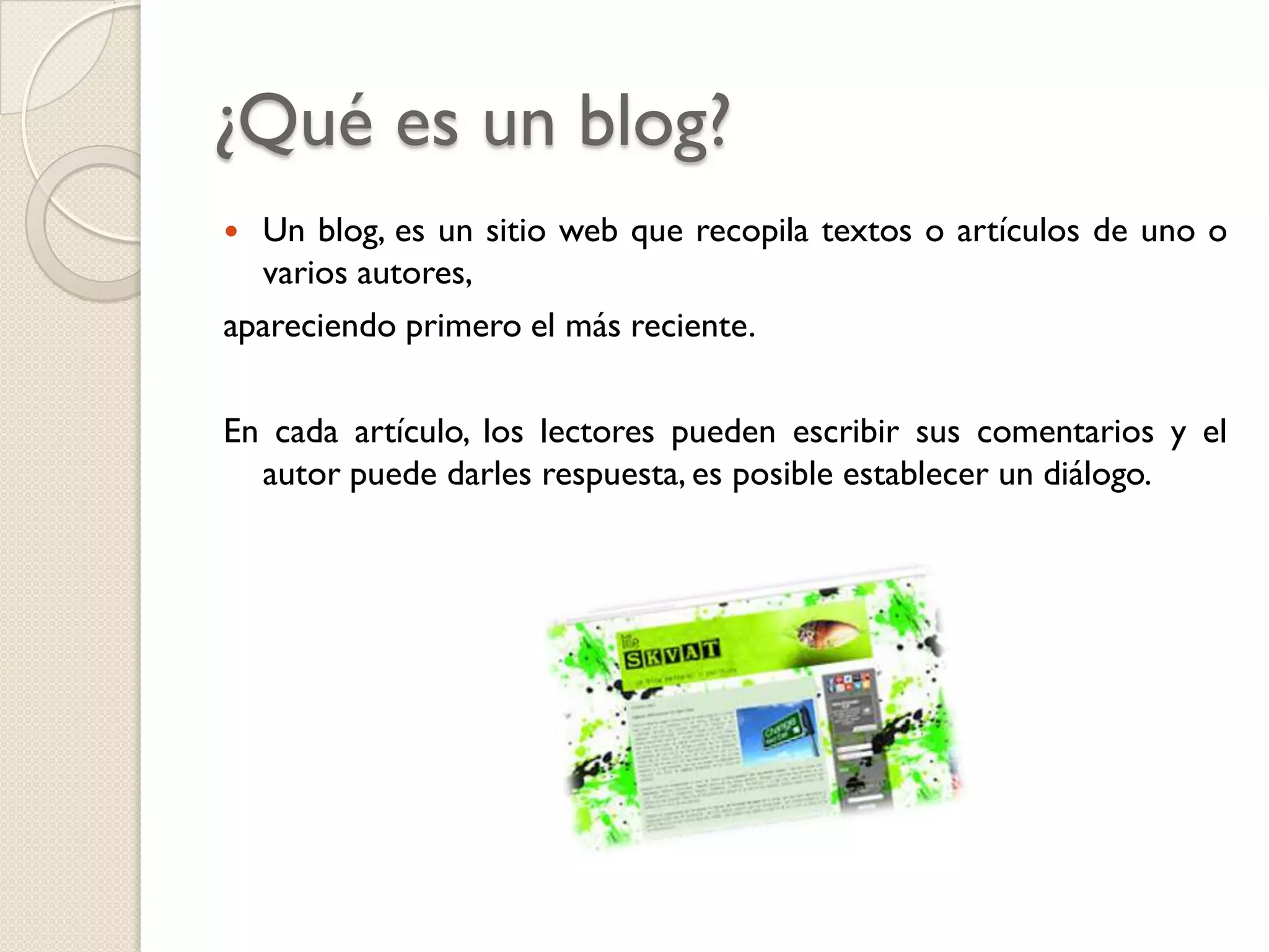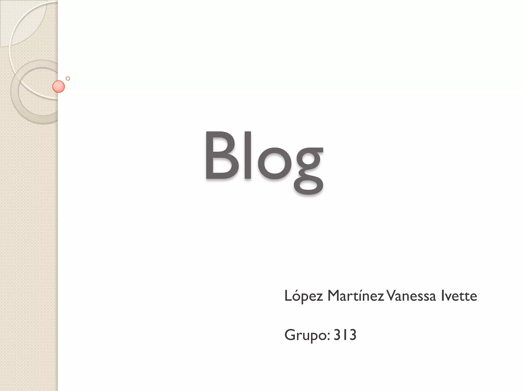 Un blog es un sitio web que recopila artículos de uno o más autores, mostrando primero el más reciente. Los blogs se usan para expresar ideas personalmente o profesionalmente y generar contenido en áreas como tecnología, educación y negocios. Para crear un blog, se requiere una cuenta Gmail y acceder a Blogger.com, donde se puede diseñar y publicar el blog.