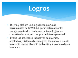 El documento habla sobre el uso de herramientas web 2.0 como blogs para sistematizar trabajos realizados en clase sobre temas de tecnología y áreas de interés personal. También habla sobre evaluar procesos productivos tecnológicos considerando sus efectos ambientales y sobre las comunidades humanas. Explica qué es un blog y algunos usos educativos que se le pueden dar como estimular la escritura y el trabajo en equipo de los estudiantes.