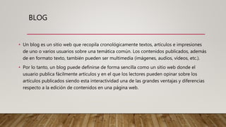 Este documento describe las características de los blogs y wikis educativos. Explica que un blog es un sitio web donde los usuarios publican artículos de forma cronológica y los lectores pueden comentar, y que un wiki permite la construcción colaborativa de conocimiento a través de páginas enlazadas que los usuarios pueden crear, modificar o eliminar. También resume las características del blog xataka.com, incluyendo su organización cronológica, búsquedas, comentarios y contenido hipermedia.