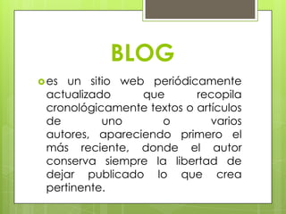 Un blog es un sitio web periódicamente actualizado que recopila artículos de uno o más autores de forma cronológica, con el artículo más reciente primero. Los blogs permiten a los autores publicar contenido libremente y a los lectores comentar y continuar conversaciones.