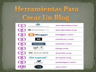 El documento define lo que es un blog, describiéndolo como un sitio web actualizado periódicamente que recopila artículos de uno o más autores ordenados cronológicamente. Explica que los primeros blogs eran páginas web personales actualizadas y que evolucionaron con herramientas que facilitaron su creación para un público más amplio. También resume brevemente la historia temprana de los blogs y algunos de los servicios de alojamiento de blogs más populares.