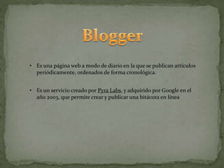 El documento define lo que es un blog, describiéndolo como un sitio web actualizado periódicamente que recopila artículos de uno o más autores ordenados cronológicamente. Explica que los primeros blogs eran páginas web personales actualizadas y que herramientas como Blogger facilitaron su creación y mantenimiento por parte de más personas. Resalta que los blogs ganaron popularidad rápidamente a finales de los 90 y principios de los 2000 y hoy son uno de los servicios más populares de Internet.