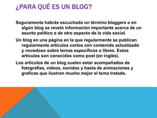 Un blog es una página web en la que personas publican regularmente artículos cortos sobre temas específicos o libres, a menudo acompañados de fotos, videos y gráficos. Los blogs permiten a las personas expresar sus ideas, intereses y opiniones. Aunque muchos blogs son escritos como un pasatiempo, también pueden usarse para compartir experiencias con familia y amigos o ganar dinero a través de publicidad.
