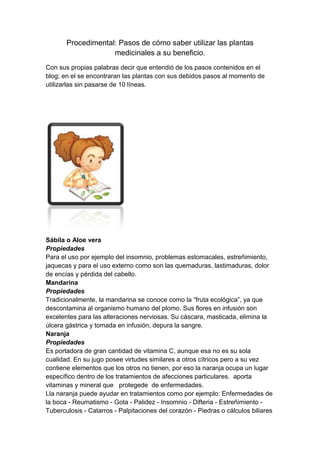 Este documento describe las propiedades medicinales de varias plantas como la sábila, mandarina, naranja, manzanilla, eucalipto, ajo, limón, zanahoria, llantén, orégano y tilo. Cada planta se detalla con uno o dos párrafos sobre sus usos para tratar diferentes condiciones de salud como problemas estomacales, inflamaciones, infecciones respiratorias, estrés y más. El documento provee información sobre cómo estas plantas pueden usarse como remedios naturales.