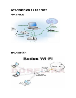 Este documento introduce diferentes tipos de redes, incluyendo redes por cable, inalámbricas, satelitales y de fibra óptica. También describe redes LAN para áreas limitadas, MAN para conexiones dentro de una ciudad, y WAN para conexiones a nivel mundial como Internet. Finalmente, explica diferentes topologías de red como bus, anillo y estrella.