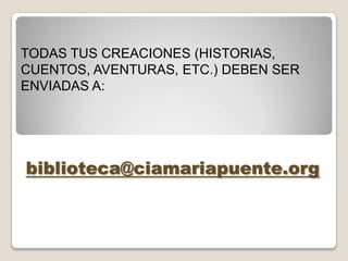 El documento invita a los lectores a enviar sus creaciones escritas como historias, cuentos y aventuras a la dirección de correo electrónico biblioteca@ciamariapuente.org para que sean publicadas en el blog de la biblioteca en poco tiempo, animando a todos a escribir y compartir sus trabajos.