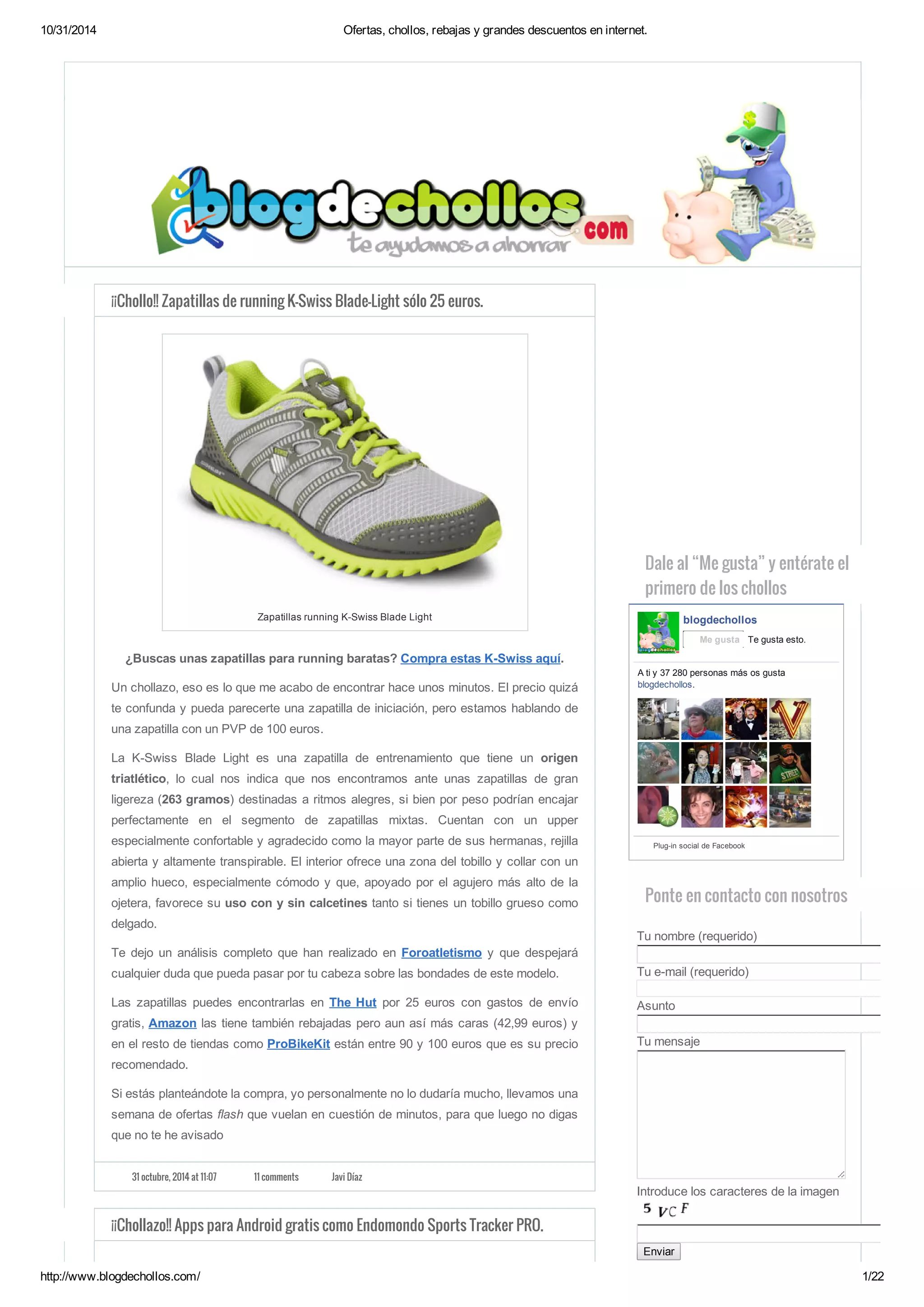 Este documento presenta varias ofertas y descuentos en productos como zapatillas de running K-Swiss a 25 euros, aplicaciones para Android gratuitas de Amazon hasta el 1 de noviembre, y un reloj Emporio Armani a 107 euros con un 55% de descuento. También incluye chollos en Crocs clásicos desde 12.95 euros y la serie completa Los Misterios de Egipto en Blu-Ray a sólo 10 euros.