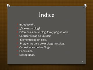 El documento presenta una guía sobre los blogs, definiéndolos como sitios web actualizados periódicamente con entradas cronológicas de uno o varios autores. Se explican las diferencias entre blogs, foros y páginas web, además de detallar sus características y elementos clave. También se mencionan programas gratuitos para crear blogs y se concluye que estos son herramientas útiles y populares en la actualidad.
