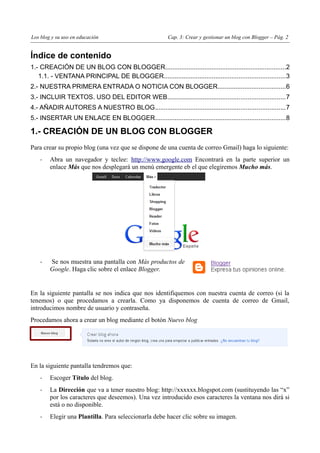 Este documento proporciona instrucciones para crear y gestionar un blog usando la plataforma Blogger. Explica cómo crear una cuenta de Blogger vinculada a una cuenta de Gmail, elegir un nombre y dirección URL para el blog, y agregar la primera entrada. También describe las opciones de configuración básicas del blog como añadir autores, insertar enlaces e imágenes, y formato del texto. El objetivo es proporcionar una guía paso a paso para que los usuarios aprendan a utilizar las funciones básicas de Blogger