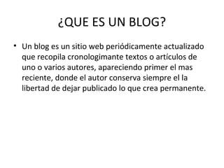 Un blog es un sitio web actualizado periódicamente que recopila artículos de uno o más autores en orden cronológico, con el artículo más reciente apareciendo primero, donde el autor tiene libertad para decidir qué mantener publicado de forma permanente.