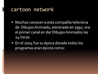 El documento habla sobre Cartoon Network, el canal de televisión estadounidense dedicado a la transmisión de dibujos animados las 24 horas del día. Destaca que en 2004 tuvo su época dorada con programas exitosos como La Vaca y el Pollito, Ed Edd y Eddy, Coraje el Perro Cobarde, Johnny Bravo, Las Chicas Super Poderosas y otros.