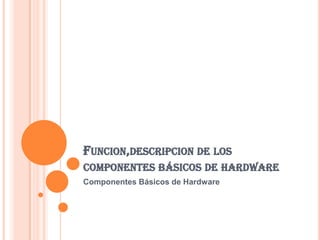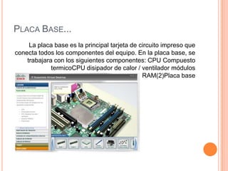 El documento describe los componentes básicos de hardware de una computadora, incluyendo la placa base, la memoria RAM, el disco duro, la tarjeta gráfica, el monitor, la fuente de alimentación y las tarjetas de adaptador. Cada componente cumple una función específica para el funcionamiento general de la computadora.