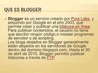 Blogger es un servicio gratuito de Google que permite crear y publicar blogs en línea sin necesidad de escribir código. Los blogs de Blogger generalmente se alojan en los servidores de Google dentro del dominio blogspot.com. Para crear una cuenta de Blogger, el usuario ingresa a www.blogger.com, crea una cuenta de Google si no tiene una, y luego puede crear su blog eligiendo un tema, nombre, plantilla y frecuencia de publicación. También es importante interactuar con otros bloggers.