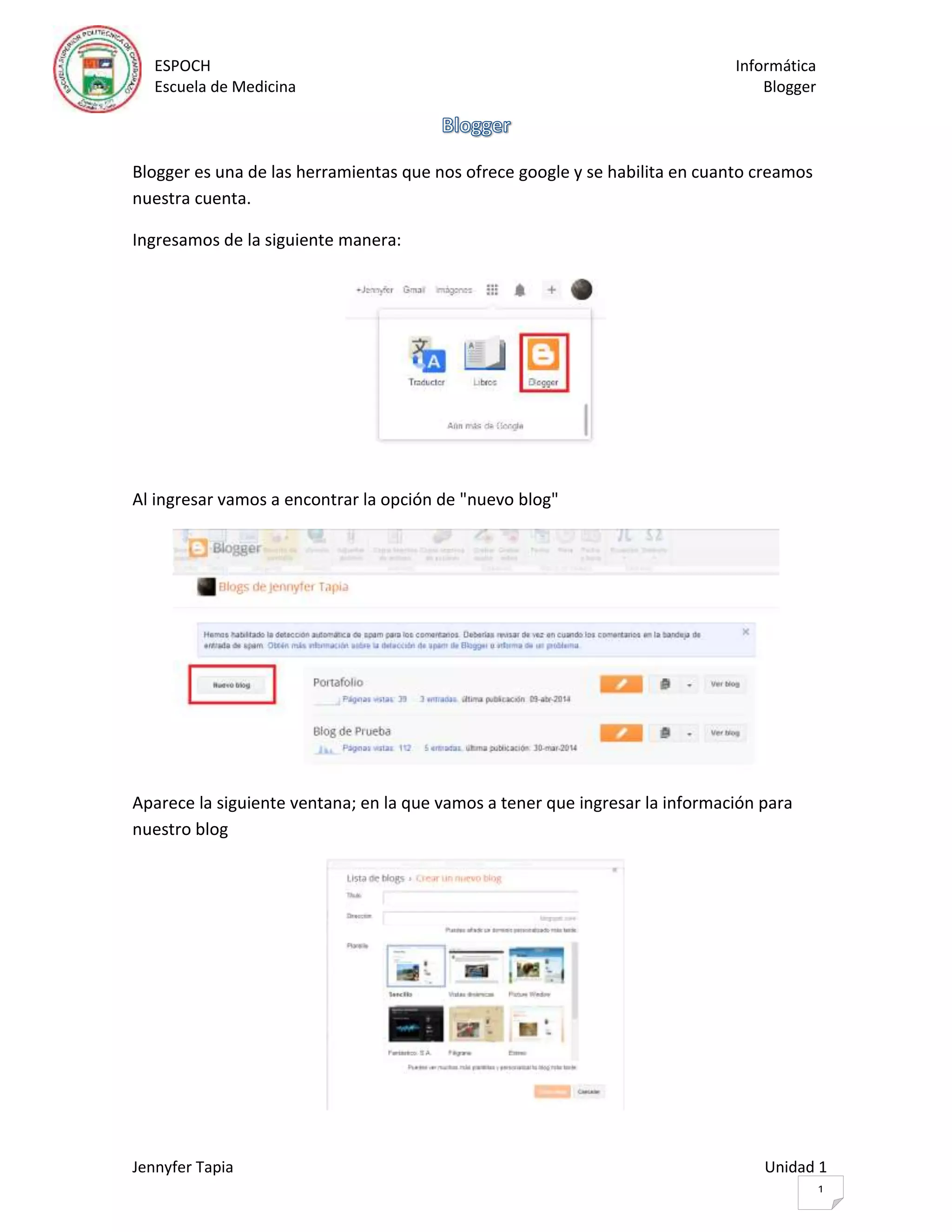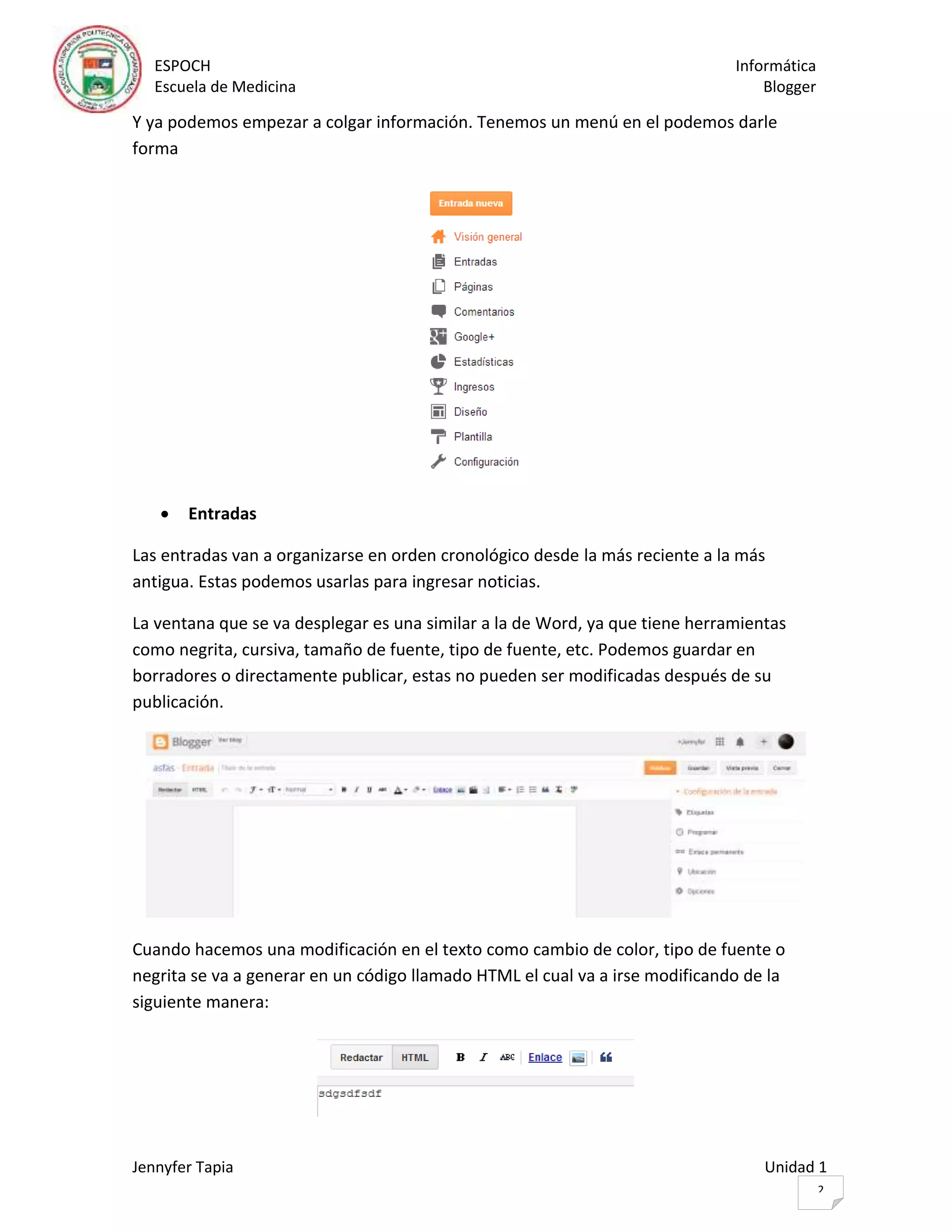 Blogger es una herramienta de Google que permite crear blogs. Ofrece opciones para agregar entradas, páginas, imágenes, videos y otros elementos. Las entradas se publican en orden cronológico y pueden editarse con herramientas como negrita o cursiva. Las páginas funcionan como hipervínculos y requieren agregar un gadget. Es posible insertar imágenes, videos y enlaces a otras páginas para complementar el contenido del blog.