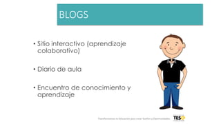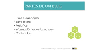 El documento describe las características y usos de los blogs en la educación. Un blog es un sitio interactivo que permite el aprendizaje colaborativo y sirve como diario de clase. Los blogs tienen un título, barra lateral, pestañas e información sobre autores. Contienen contenidos educativos como conceptos, cronogramas, logros, fotografías, videos y enlaces. Los estudiantes pueden interactuar generando contenido y actualizando el blog mediante tareas y proyectos colaborativos.