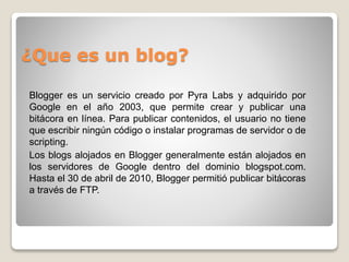 Blogger es un servicio creado en 1998 que permite crear y publicar blogs en línea de forma sencilla y gratuita. Los usuarios pueden publicar contenido llenando un formulario en lugar de escribir código HTML. Blogger fue adquirido por Google en 2003 para proporcionar más recursos a los usuarios.