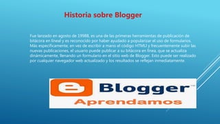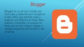 Blogger es un servicio gratuito creado en 1998 que permite a los usuarios crear y publicar blogs en línea de forma sencilla y sin necesidad de escribir código. Los usuarios pueden agregar contenido a través de un formulario web y ver los cambios reflejados de inmediato. Blogger popularizó el uso de formularios para publicar contenido en blogs.