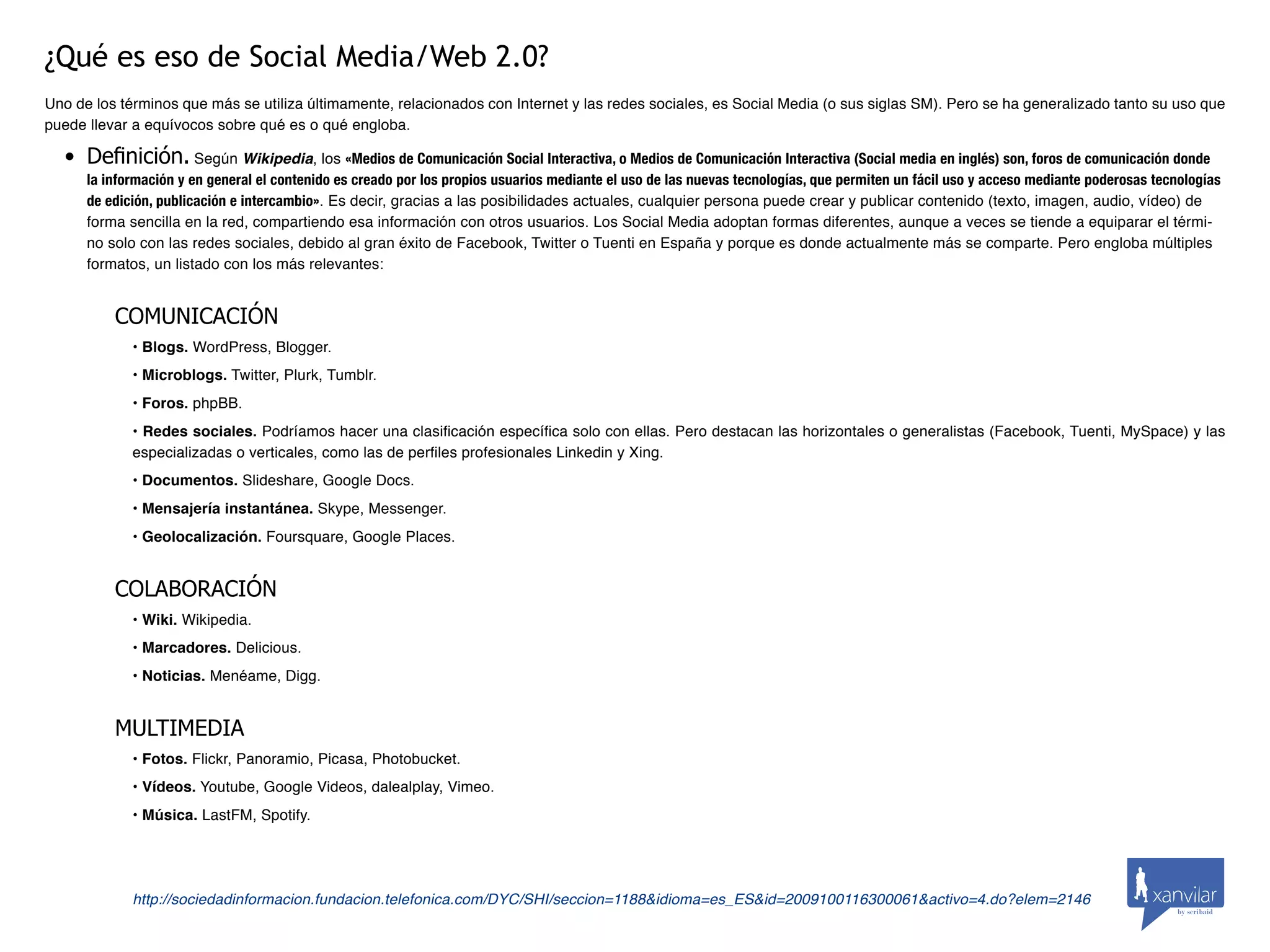 Este documento define Social Media/Web 2.0 y explica algunos de sus formatos más relevantes. Social Media se refiere a medios de comunicación donde los usuarios crean y comparten contenido fácilmente a través de nuevas tecnologías. Algunos formatos populares son blogs, redes sociales, microblogs, foros, documentos compartidos, mensajería instantánea y geolocalización. La Web 2.0 también permite la colaboración a través de wikis, marcadores sociales y noticias votadas por usuarios.