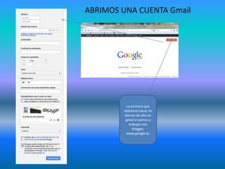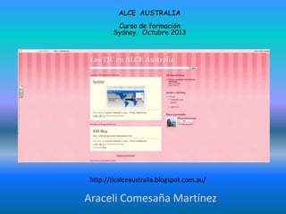 Este documento proporciona instrucciones para configurar y publicar entradas en un blog utilizando la plataforma Blogger de Google. Explica cómo crear una cuenta de Gmail, configurar la apariencia y diseño del blog, añadir páginas, editar entradas, insertar imágenes y publicar contenido para que sea visible a los lectores del blog. El objetivo final es establecer este blog como un recurso compartido para los profesores de la organización ALCE en Australia.