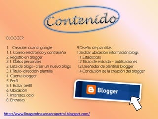 El documento describe los 14 pasos para crear un blog en Blogger. Estos incluyen 1) crear una cuenta de Google, 2) registrarse en Blogger e ingresar datos personales, y 3) crear un nuevo blog eligiendo un título, dirección y plantilla. Finalmente, el blog está listo para publicar entradas y contiene herramientas para editar perfiles, diseñar plantillas y ver estadísticas.