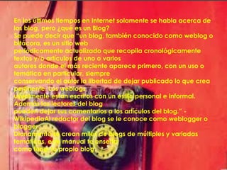 Un blog es un sitio web periódicamente actualizado que recopila cronológicamente artículos de uno o más autores sobre un tema particular. Los blogs suelen tener un estilo personal e informal y permiten que los lectores comenten los artículos. Existen diferentes tipos de blogs como audioblogs, fotoblogs, videoblogs y moblogs, dedicados a diferentes formatos multimedia.