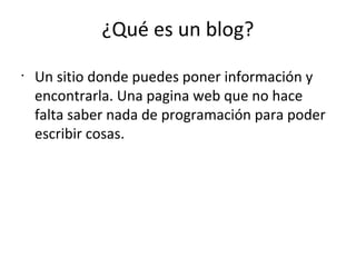 Un blog es una página web donde puedes publicar información sin necesidad de conocimientos de programación. Los blogs se pueden usar como diarios personales, para demostrar el progreso del aprendizaje o compartir contenido sobre intereses personales. Algunos servicios populares para crear blogs son Tumblr y Blogger.