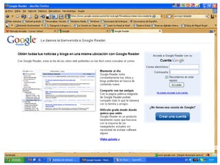 Google Reader permite seguir fácilmente los blogs de otros sin necesidad de visitarlos diariamente. La presentación explica cómo usar Google Reader en cuatro pasos para seguir blogs de forma sencilla y compartir contenido bajo una licencia Creative Commons.