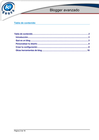 Este documento proporciona información sobre cómo personalizar y configurar un blog en Blogger. Explica cómo editar el diseño y los colores de la plantilla, añadir elementos como encuestas y gadgets, y configurar opciones como los comentarios y permisos. Además, clasifica diferentes tipos de blogs según su temática, como personales, políticos, técnicos o periodísticos.